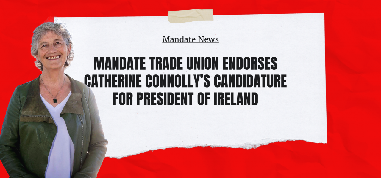 The National Executive Committee (NEC) of Mandate Trade Union – which represents over 20,000 bar and retail workers across the country – at its meeting yesterday (Sunday, 5 October) decided to endorse Catherine Connolly’s candidature for President of Ireland.
