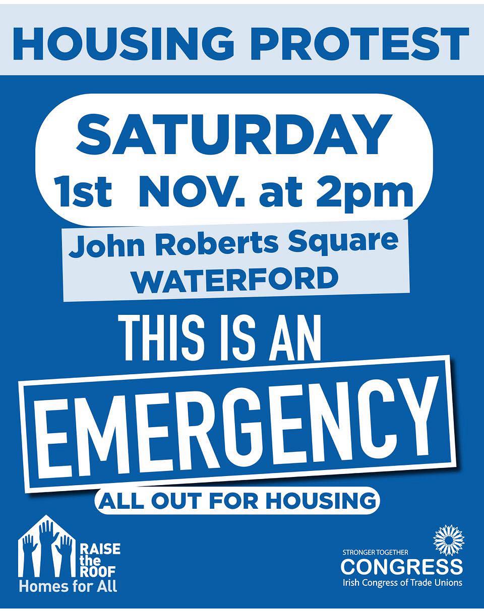 The protest will take place in Waterford City this Saturday 1st November at 2pm starting in John Roberts Square. The event will feature a wide range of trade union, student union, community and political speakers.